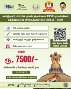‘நான் முதல்வன் UPSC உதவித்தொகை திட்டம்’ योजना के तहत प्रारंभिक परीक्षा उत्तीर्ण करने वाले 1,000 पात्र छात्रों को ₹7,500 मासिक सहायता दी जाएगी।,परीक्षा तिथि: 26 जुलाई 2025 ,आवेदन की अंतिम तिथि: 10 जुलाई 2025,पोर्टल: www.naanmudhalvan.tn.gov.in